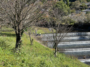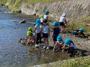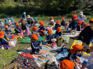 年少、年中は早くもお弁当。広い青空の下で、大きな声でいただきまーすの声がして、笑顔いっぱいいただきます。