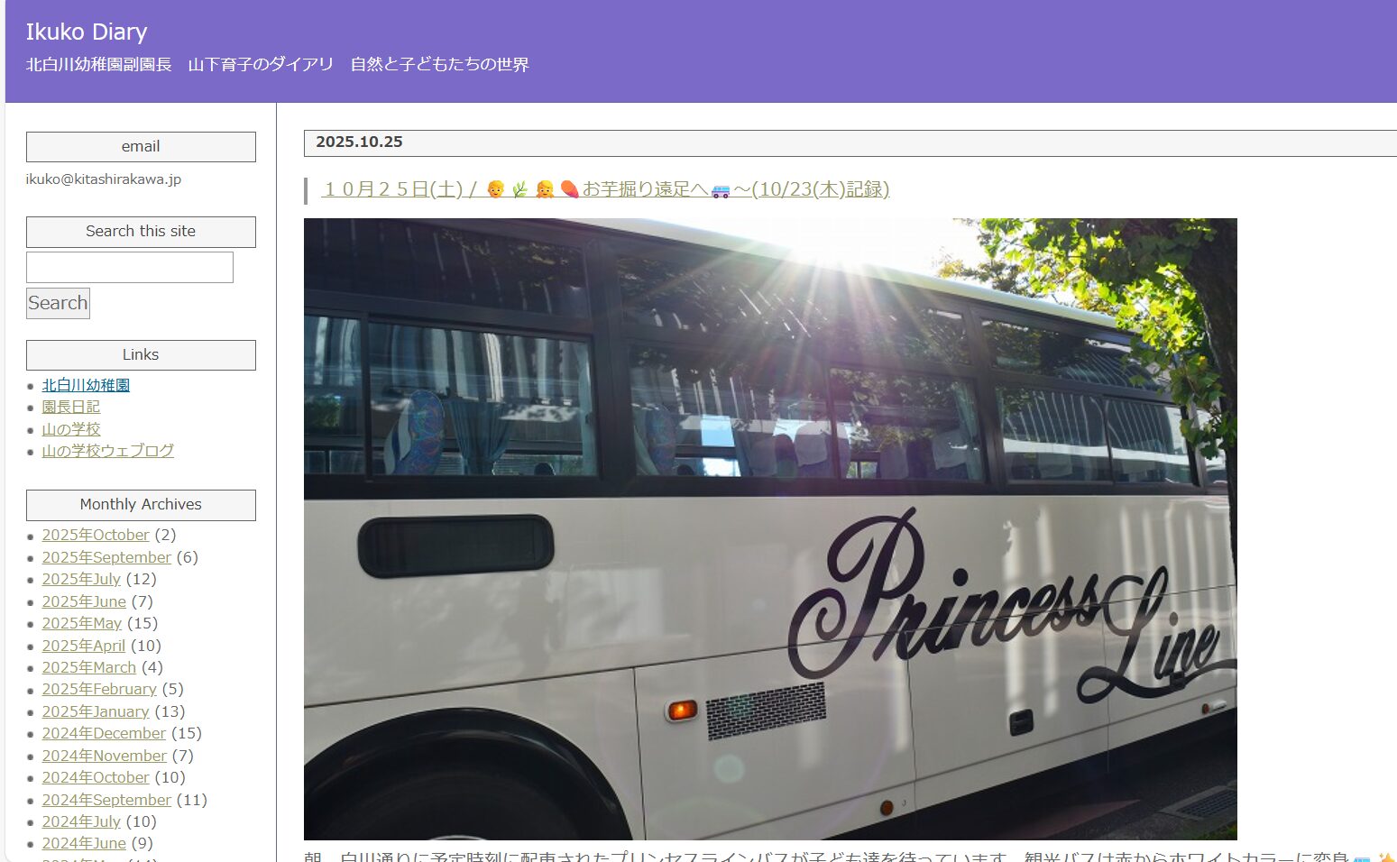 2025-10-25 Ikuko Diary更新(遠足) 2025 10/25 お知らせ 2025年10月25日 遠足の詳細なレポートがIkuko Diaryにアップされました。 >>10月25日(土) / お芋掘り遠足へ~(10/23(木)記録) たくさんの写真と詳しい説明が臨場感たっぷりに当日の楽しい遠足の様子を伝えています。 ぜひご覧ください。 お知らせ よかったらシェアしてね! URLをコピーしました! URLをコピーしました! 2025-10-24 えにっき更新 2025-10-26 秋の俳句 関連記事 2025-12-09 Ikuko Diary更新 2025年12月9日 2025-12-07 Ikuko Diary更新 2025年12月7日 2025-12-03 Ikuko Diary更新 2025年12月3日 2025-11-29 Ikuko Diary 更新 2025年11月29日 2025-11-28 卒園児の活躍! 2025年11月28日 2025-11-24 明日の天気は雨模様 2025年11月24日 2025-11-22 山の学校冬学期会員募集中 2025年11月22日 2025-11-21 来週の教育講演会 2025年11月21日 コメント コメントする コメントをキャンセルコメント ※ 名前 ※ メール ※ サイト Δ