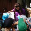 となりの第二グループはIkuko 先生も手伝ってレインコートを着ることにしたようです。では第四も、ということで、私はめいめいのカバンの中のレインコートを取り出し、「できる人は自分で着てね」と言いながら、一人一人に着せていきました。Ikuko先生もお手伝いに来てくれています。