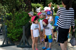 ライオンの口から水が出るのを待ち構える子どもたち。