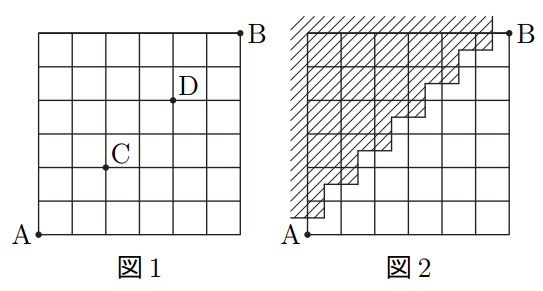 (3) 図2 において,点A から点B に行く最短経路は全部で何通りあるか求めよ.ただし斜線の部分は通れないものとする.