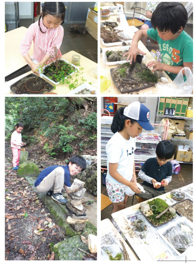 材料というよりは「庭の住人」を探すつもりで、みんなには、苔や草花を少しだけ「分けてもらう」という気持ち、道などの「すみっこ」に注目すること、この2つを伝えています。「この小さいお花、何だろう」といって連れてきた草が、次のクラスで赤々と実をつけていたり、何も植えていない場所に何かの芽が生えてきたり、そうした意外な発見も楽しみの一つです。石や砂も集めようと出かけた沢で「ダムづくり」に熱中するなど、時に「有意義な脱線」があるのは勿論のこと。