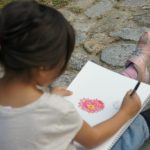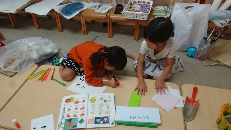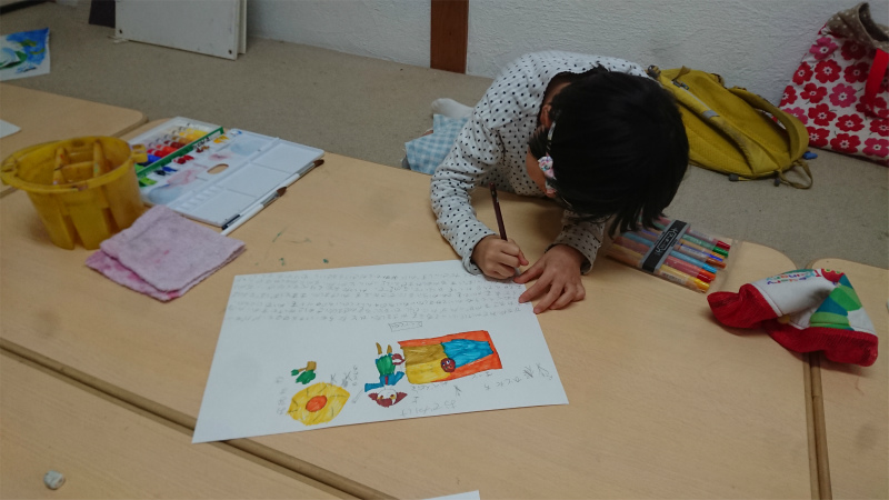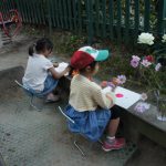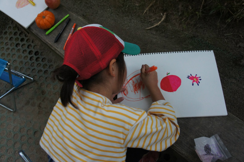 切り花や観賞用のカボチャ(ハロウィンにちなんで)などのモチーフがありましたが、Kikoちゃん、Honoちゃんは、それらを外に連れて行って、どの場所で描くのが良いか考えました。Rちゃんは室内で静かに集中して描くことを選びました。A君は「虫を見つけて描く」と心にきめて、虫取り網を手に奔走しました。「何としても自分で見つけるぞ」という執念が感じられました。