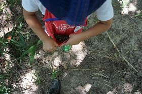 本日は、年中クラスでの秋についてのお話に続き、早速コンポストの腐葉土をそっと掘り返して、小さな命が息づいていることを確かめてみました。