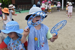 本日はシャボン玉の日。天候に恵まれ全学年がシャボン玉を楽しみました。過去にも夏の保育でシャボン玉をしましたが、今年はとてもお楽しみ😊。それは・・・、手作りのお道具に加え、数種類のシャボン玉グッズ(Bubbler各種、Bubbleトランペット、自動Bubble製造マシン等 )が仲間入り。夢のようにオルゴール曲がお庭に流れる中、シャボンと戯れる時となりました。