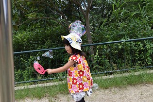 あっ、だんだん大きくなってきたシャボン玉。もっと大きくなるから見ていて。