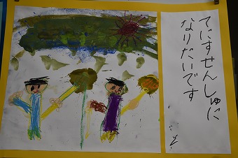 最後に頂戴しました手作り絵本『おやまむらようちえん』を数ページのみご紹介させていただきます〔数ページ抜粋〕。夕陽の中でゆっくりページをめくり拝見していると、トンネルの向こうの夢に向かって歩む子ども達の後ろ姿が見えるようでした。