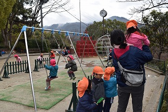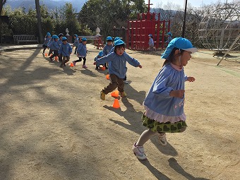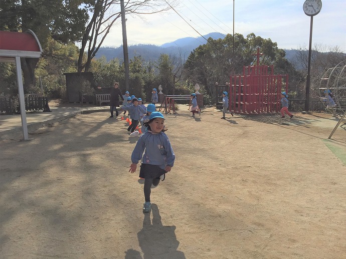園生活の三年間、ご家庭と園のあるお山の上までの道のりを毎日歩いて通園し、気候のよい時季には園庭から続くひみつの森の先までを所狭しと駆け回りました。四季が移り変わる自然の懐に包まれ過ごした積み重ねが、この先の子ども達をしっかりと支えてくれる土壌となりますことを心より願っています。