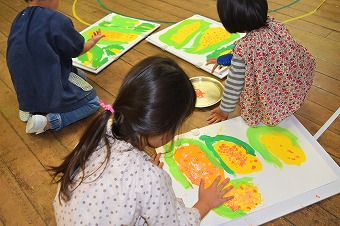 子ども達が順番に自分の手形をペタペタと生地にハンドペインティングしていきました。