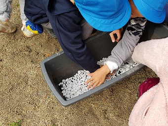 いっょにやろうよ。このくらいかな? たくさんの手が軽石を上手く入れています。