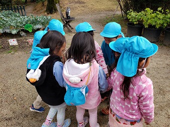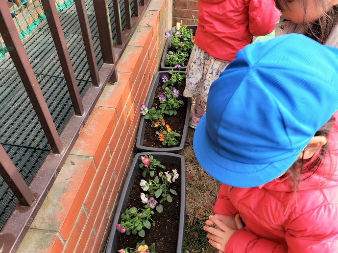 ゆきぐみ、ほしぐみの第一園舎前で、みんなで育てるためのパンジーが到着しました。