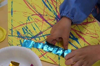 明るい水色の色画用紙にもキラキラと輝いています。