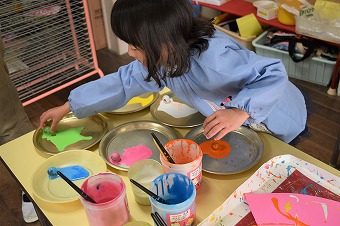 この前お休みしたからこの日に転がし絵をするNちゃん。先生から一度説明を聞いたらすぐに取り組み始めました。ビー玉に好きな色の絵の具をつけて、トレイの上にのせた台紙の上に置いたら・・
