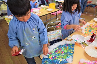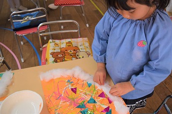 端っこから丁寧に綿をつけています。 子ども達の作業中は集中していてとても静かです。