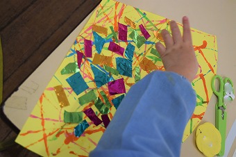 貼り方もさまざま。同じ色をつないで貼っていくのも素敵。転がし絵の台紙のどこへ貼るかは子ども達の自由な感性。