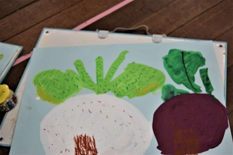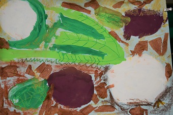 そして、過日にお花紙で土を表現した上にコンテで最終仕上げをした畑のカブラが出来上がりました。一部ご紹介です。