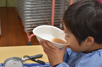 いただきますのご挨拶をみんなでした後、早速温かいお味噌汁をいただきました。