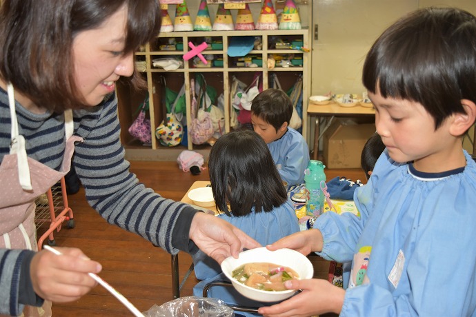この日は瀬川先生の体育指導日で各学年が順に体験しています。年長クラスはすでに指導を受け、カブラのお料理中。そこへ、お昼前になり他学年の指導を終えた瀬川先生がこちらにご挨拶に来て下さったところのグッドタイミングに、みんなで作ったカブラのお味噌汁をお渡しすると~😊😊