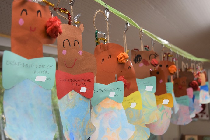 ずらりとぶら下がったこちらはクリスマスカード。サンタさんへのお願いが書いてあります。実は靴下部分は初めてマーブリングに挑戦したものです。きれいなマーブル模様が淡くて素敵な色を出しています。