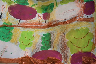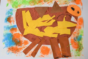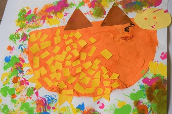 こちらは年少クラスのとっても可愛らしいイノシシ。下地は好きな色の色画用紙を選び、霧吹きでシュッ、シュッとスプレーをしました。色が混ざり合ってなかなかきれいです。