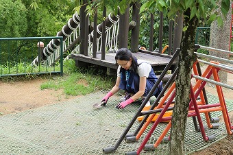 この日は一学期最後の未就園児親子にお出でいただく園庭開放の日でした(毎金曜10:30~11:30開催。次回は9/6(金)~)。お砂場、ブランコ、すべり台やアスレチックであそんだ後、お天気の良い日は月曜開催の親子登園同様ひみつの庭で水あそびをすることもあります。
