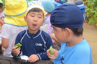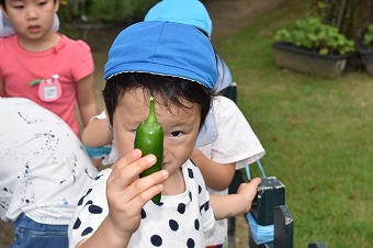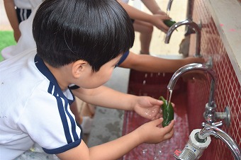 この日、年長クラスも夏期保育最後の水あそびの前に、畑にたくさん成っているきゅうりを全て収穫しました。
