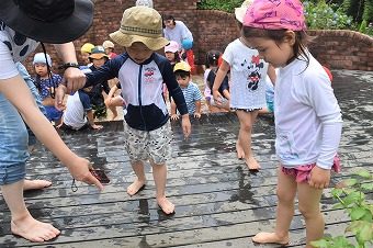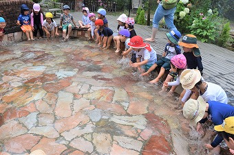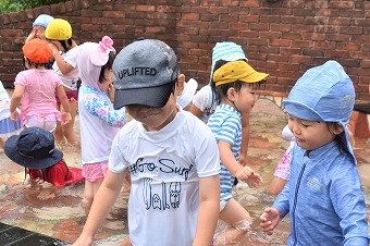 一旦、園長室に戻り業務の傍ら再度外へ出ると、早、水着に着替えて水あそびに行くところでした。一学期はっこ梅雨の最中ですが、時間の合間をみて何度も水あそびを楽しんでいます。