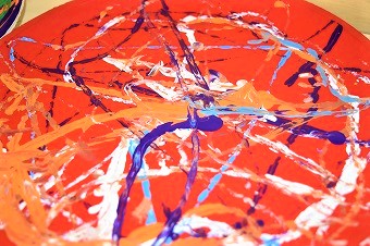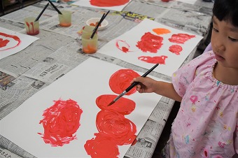 「やってるよ~~!」年中クラスに行くと自分の好みの色で、スポンジを使ってベースになる色をペイントしていた子ども達。手についても大丈夫。乾いてしまっても水でしばらく擦ると洗い落とせます。