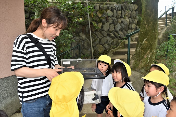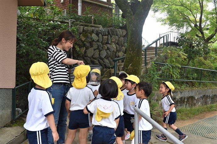 第三園舎前で先生がフタを開ける前に、「この前のアゲハは壁にとまってじっとしていたよ」と女の子。さてどうなるでしょうか? すぐさま西の空の方にサッと飛び立っていく姿を月Aクラスのみんなで見守ることができました。よかったですね😊