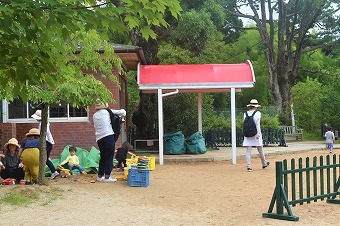 夏期保育一日目(7/18)は子ども達の登園前からタイミングよく雨が上がってきて、各学年が順に壁泉プールで水あそびをすることができました。気温28℃、湿度78%で朝から蒸し暑い日が続いていました。そして夏期保育二日目(7/19)のこの日は”お盆をつくろう”という設定で各クラス、学年に分かれて制作を行いました。