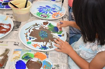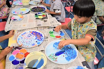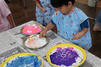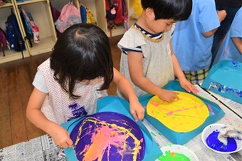 それぞれが集中して取り組んでいます。年長クラスは薄い水色、黄色をベースカラーとして先に塗って乾かす作業を終え、絵筆、大小各種綿棒を使いトレイ全体に自由に描いています。