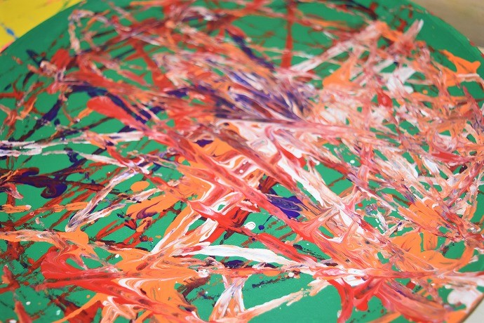 鮮やかなベースカラーの上にビー玉で転がし絵をしてつくったお盆の完成でーす😊