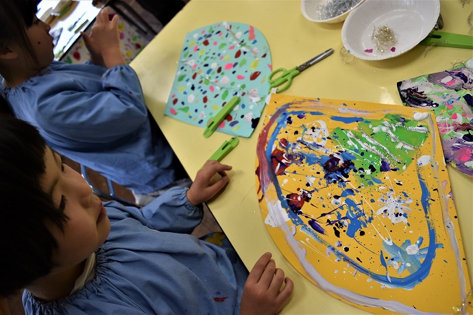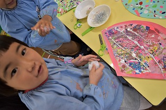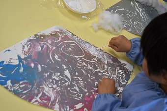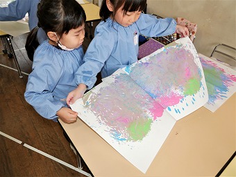 つづいてこちらは年中クラス。吹き絵で色画用紙に模様をつけた後、↙︎