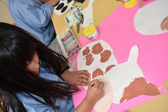 こちらはお隣のクラス。はさみで牛さんの形に切り取っているところです。