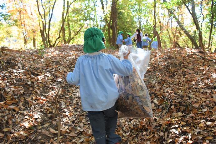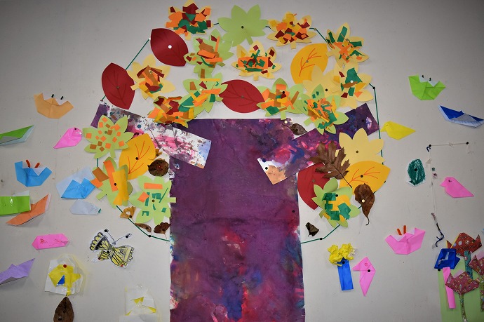こちらはみんなで作った合作の大きな木。色とりどりの落ち葉や鳥、昆虫がたくさんいます。アゲハチョウも飛んでいます。みんなで過ごした今年を振り返るとあっという間でしたが凝縮した体験で盛り沢山の一学期、二学期でした。