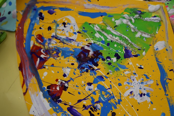 年少児はデカルコマニー、年中児はドリッピング(吹き流し絵)でクリスマス帽子を製作していますが、年長児は絵の具を使って自由に絵を描きました。こちらは絵の具をドロップしてスパッタリングのように色鮮やかになりました。