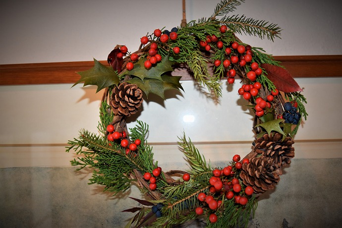ベースの緑はモミノキやドイツトウヒ以外に、ヒノキやスギの葉などを束ね、山帰来(サンキライ)やナンテンの赤い実などを合わせてもクリスマスや新年にかけて素敵なお飾りができそうです。