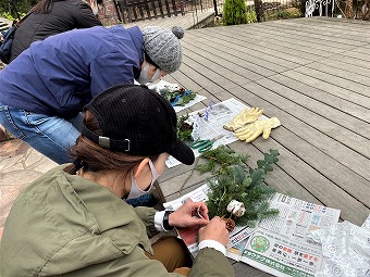 特に冬場は針葉樹の葉の緑が美しい季節です。作っているとモミノキの枝やスギ、ユーカリの葉などから手で触れるたびに芳香が漂い、すっかり手に香りが移ってしまうほどでした。いずれドライフラワーになるのでその風合いも楽しめたらと思っています。