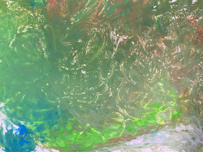青系、赤系の色が下で混ざり合い、何とも言えない色合いができあがりました。新たな技法を探り、チャレンジした発明的マーブリングの実践編となりました。