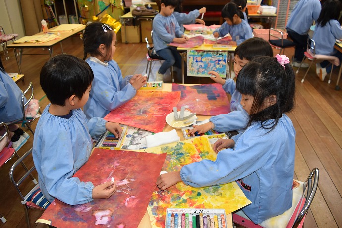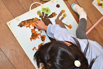 今年の年少クラスの子ども達は入園以来逞しく遊びこみ、多くの体験を通して何でも前向きにチャレンジできる子らに成長しています。自分の両手で絵の具を混ぜていく面白さを経験しながら、汚れを気にせず自由にのびのびと気持ちを開放して表現する時間はこちらもワクワク感で楽しくなりました。活動の様子は以下にご紹介しています。