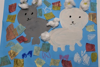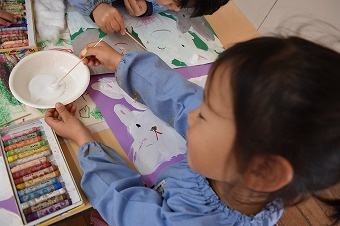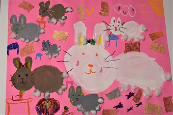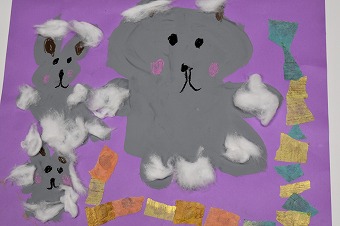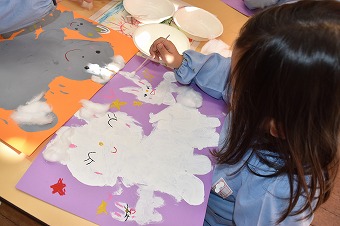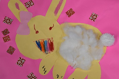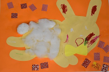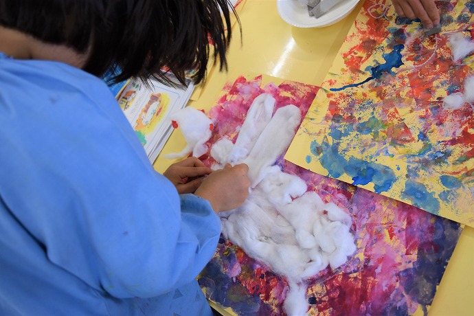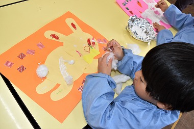 年長クラスは綿でうさぎさんを貼り絵したのは初めての方法で初体験でした。