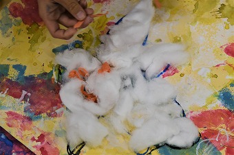 来年の干支うさぎを色画用紙をカットして台紙に貼り、この日はふわふわの綿をボンドにつけて貼っていきます。ボンドの量や綿棒の使い方で塗りやすくもあり、塗りにくくもあり…。