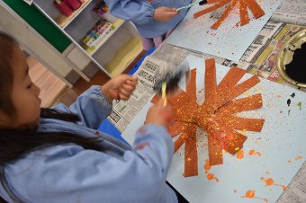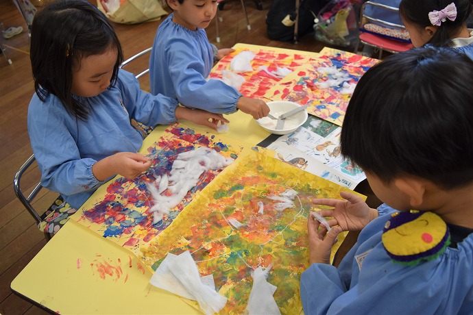 そしてこの日は自分の作品に手を加えます。クラス内も秋の落ち葉を描いた作品を展示し、みんなで描いた絵に包まれて日々を過ごしています。
