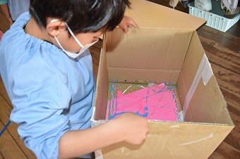 絵具がついたビー玉を使って「ころがし絵」をした日の様子です。