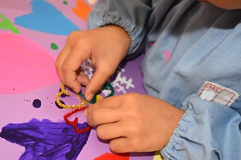 まあ! こちらはピンク色のモールを選んでお花のような形につくっているところ。