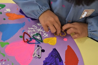 年長クラスはモールを使います。クリスマスカードの縁もモールでアレンジをしましたが、モールで形をつくってお帽子のてっぺんに飾ることになりました。もちろん絵の部分にモール飾りをあしらっても素敵です。