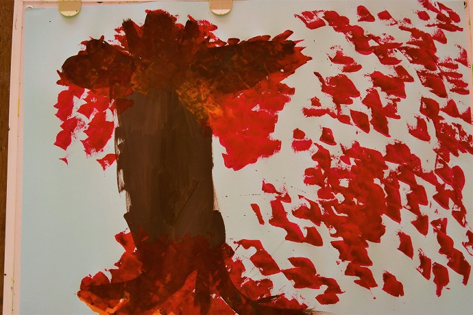 クリスマスの木であるモミノキやドイツトウヒが園内にはあります。ある日それをみんなでよく観察し、作った木の中に枝や花を描いてみました。別の絵画の日に、落ち葉を選んでじっくりと見て描くことをした後なので、ドイツトウヒの枝や針葉のつき方など、改めてじっくりと観察をしながらクレパスで木の中に描き込むのも真剣でした。