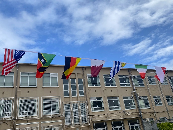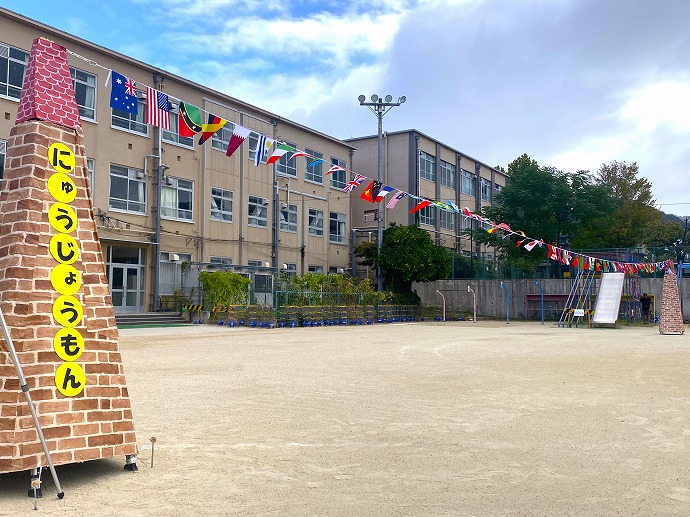 お手製の入場門&退場門と万国旗🚩🚩 ここは何度も皆さまにご出場いただく門。