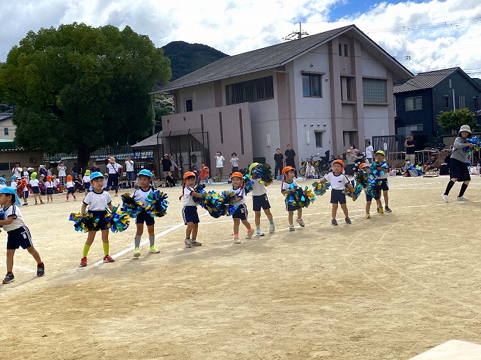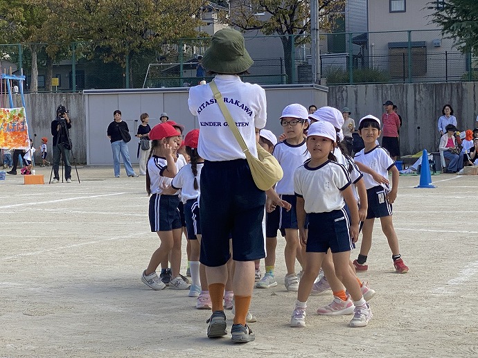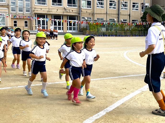 アンダーソン作曲の”フィドルファドル”の曲ととに、年長、年中、年少クラスがかけっこでトラックを一周走って入場し開会式となりました。