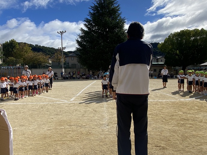 園長先生からのご挨拶のあと、たのしい運動会の歌♪、ハイホー体操を行いました。今日の欠席はなし。全員参加の嬉しい日となりました。